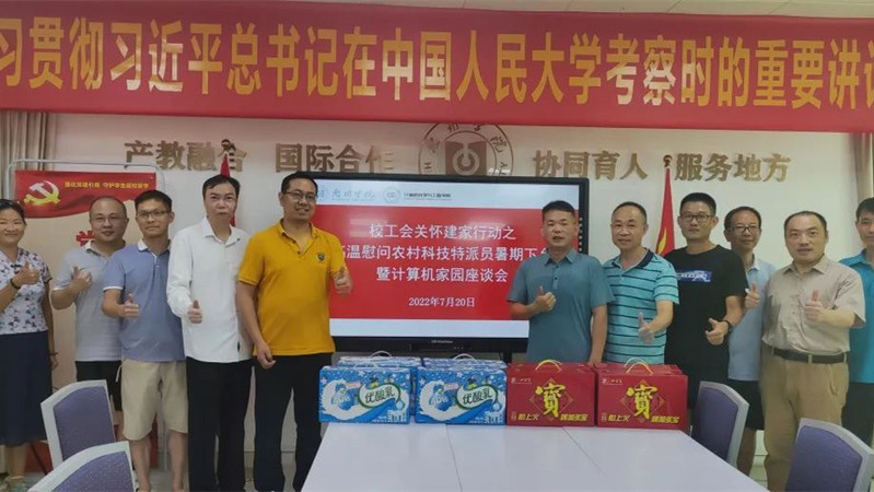 2022年7月22日下午,校工会常务副主席李富明带队到计算机科学与工程学院,慰问暑假高温期间仍然奔走在田间地头、工厂企业的农村科技特派员和企业特派员,并送来了消暑饮料。